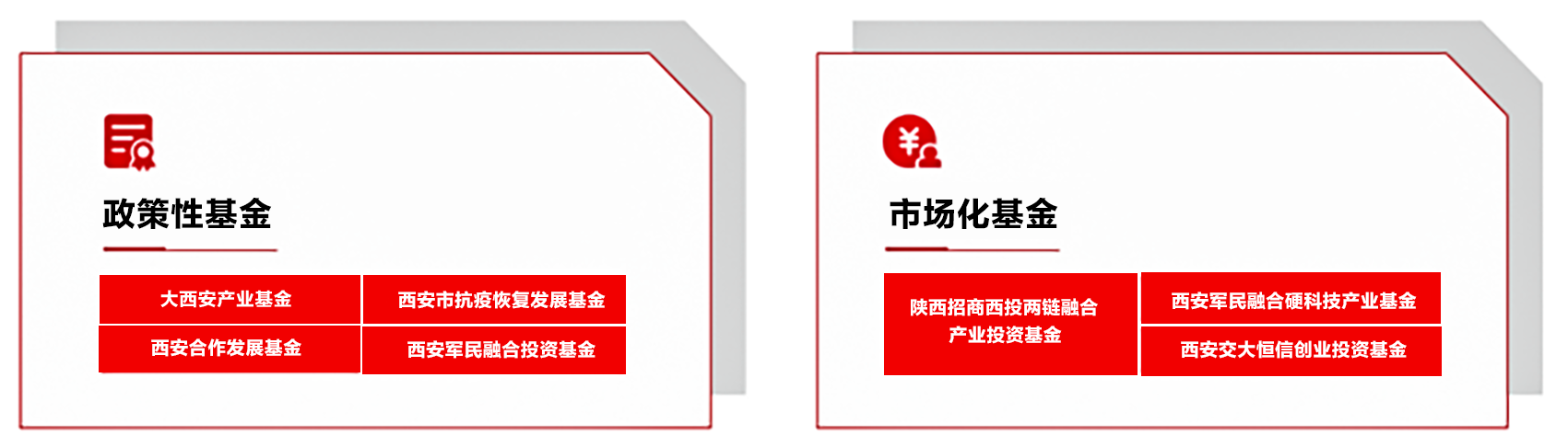 已發(fā)起設(shè)立大西安產(chǎn)業(yè)基金,全國首支兼顧“抗疫紓困”和“產(chǎn)業(yè)發(fā)展”的西安市抗疫恢復(fù)發(fā)展基金、西安合作發(fā)展基金、軍民融合基金等,參與設(shè)立陜西西安國資國企綜合改革試驗基金,西安市工業(yè)(支柱產(chǎn)業(yè))倍增基金等,設(shè)立招商西投兩鏈融合基金。