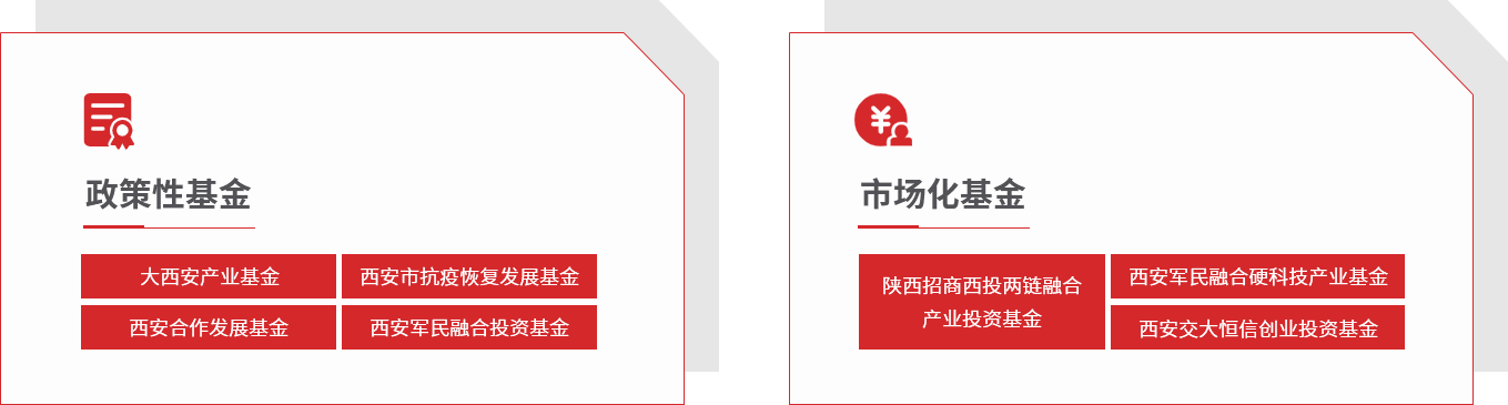 已發(fā)起設(shè)立大西安產(chǎn)業(yè)基金,全國(guó)首支兼顧“抗疫紓困”和“產(chǎn)業(yè)發(fā)展”的西安市抗疫恢復(fù)發(fā)展基金、西安合作發(fā)展基金、軍民融合基金等,參與設(shè)立陜西西安國(guó)資國(guó)企綜合改革試驗(yàn)基金,西安市工業(yè)(支柱產(chǎn)業(yè))倍增基金等,設(shè)立招商西投兩鏈融合基金。
