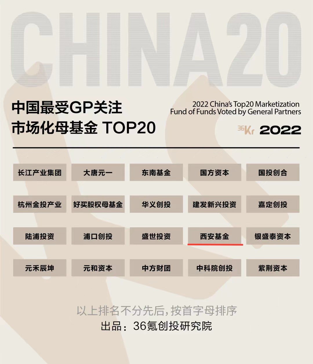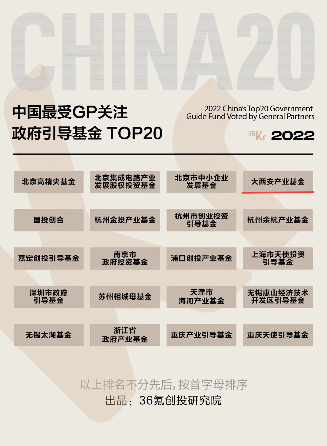 2022年9月21日,在36氪“2022 置身事內(nèi)·中國基金合伙人峰會(huì)”上,36氪創(chuàng)投研究院公布了2022年度「本土市場(chǎng)」、「白馬/黑馬」以及「最受GP關(guān)注LP」三大系列年度榜單。在「最受GP關(guān)注LP」系列榜單中,大西安產(chǎn)業(yè)基金榮獲“中國最受GP關(guān)注政府引導(dǎo)基金TOP20”,西安產(chǎn)業(yè)投資基金管理有限公司榮獲“中國最受GP關(guān)注市場(chǎng)化母基金TOP20”。